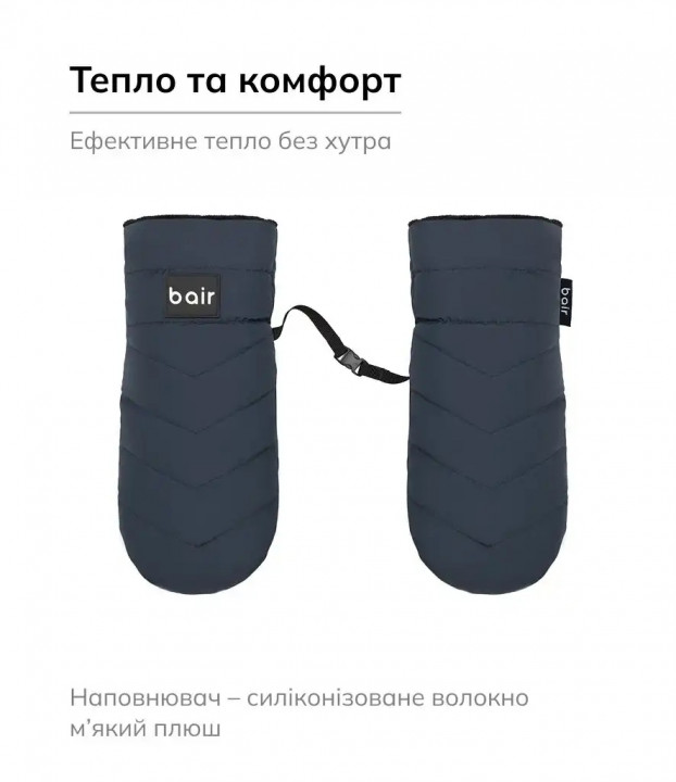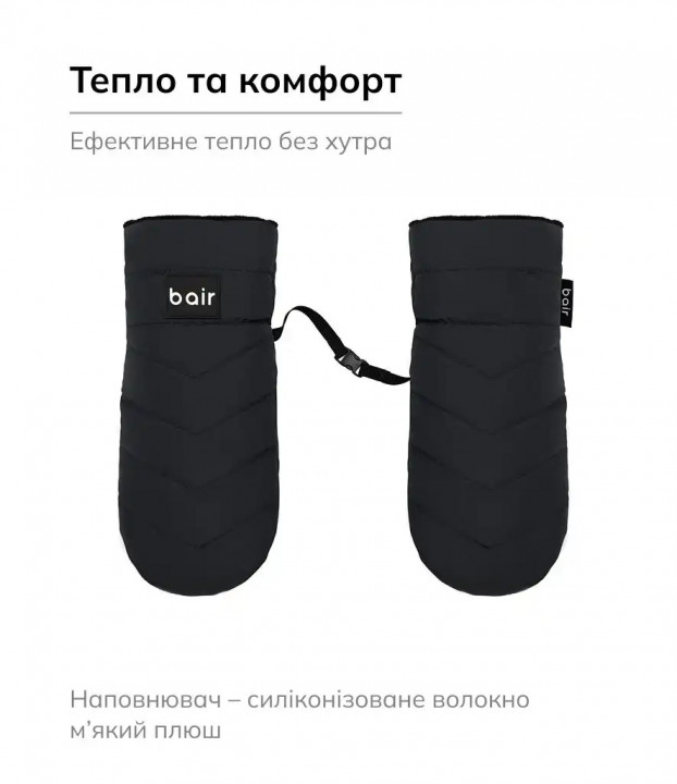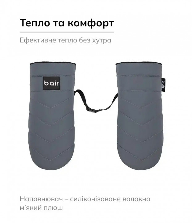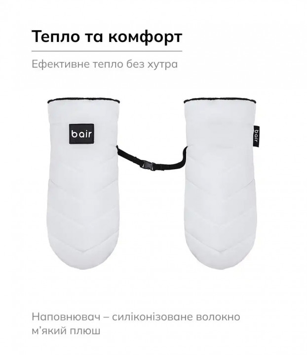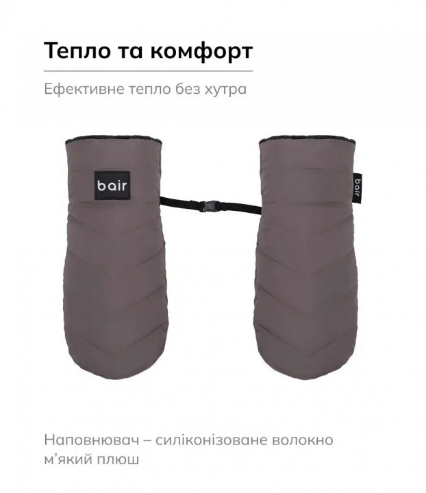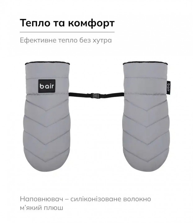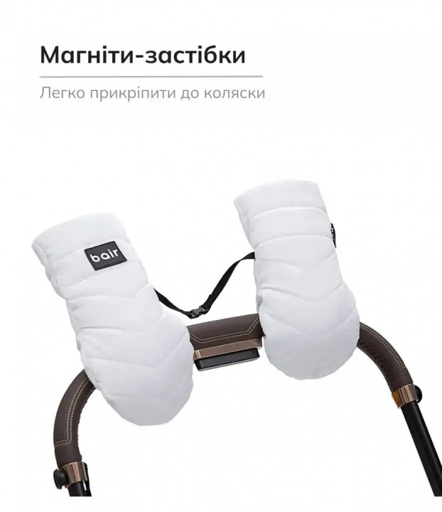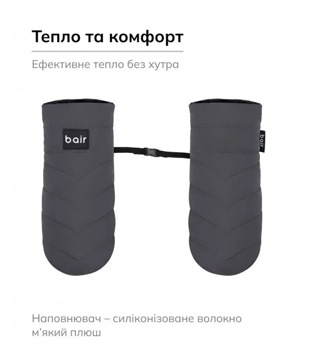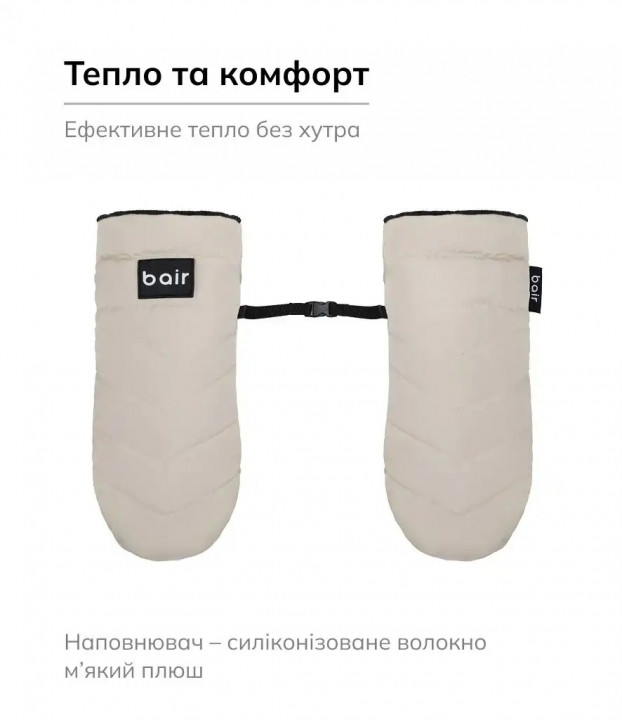 Рукавиці для рук Bair Thermo Mittens - корисний аксесуар для коляски, який зігріє руки батьків під час морозів, і не дасть осінній негоді перешкодити прогулянкам з дитиною. Проста і надійна система фіксації дозволяє використовувати її не тільки з різ...