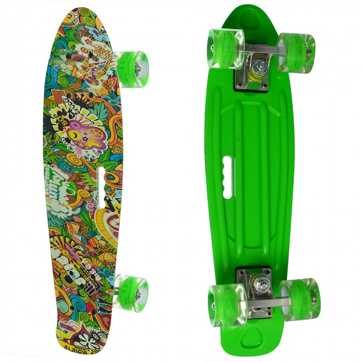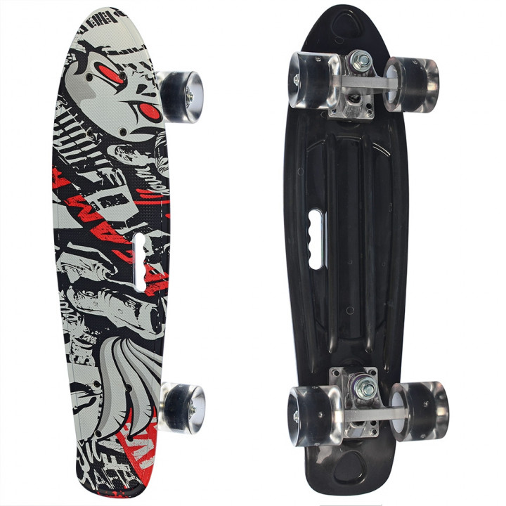 Ця модель пенні борда має довжину 55 см і завширшки 15 см. Матеріал деки - посилений прозорий пластик і витримує навантаження до 80 кг.