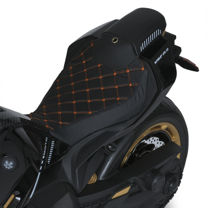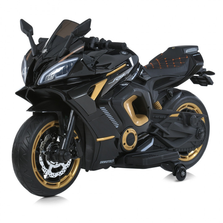Дитячий електричний мотоцикл Bambi M 6016 оснащений одним посадковим місцем з шкіряним сидінням, а також кермом з панеллю приладів, дзеркалами заднього виду і гумовими колесами.