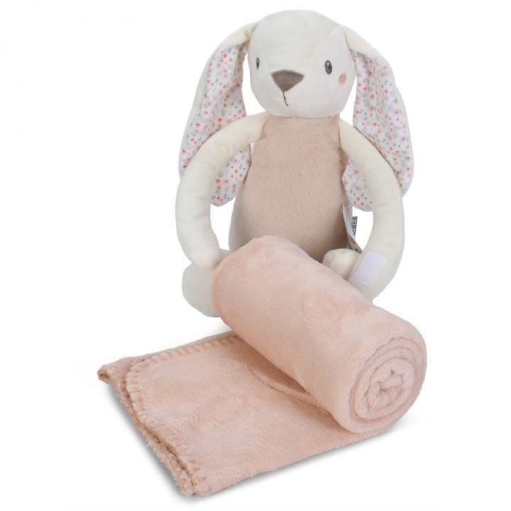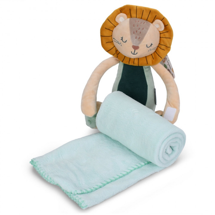 М’який плед розміром 97×71 см ніжний, теплий та приємний до тіла, з мʼякою іграшкою 35 см з лапками на липучках — можна обіймати, підвішувати до візочка чи ліжечка
